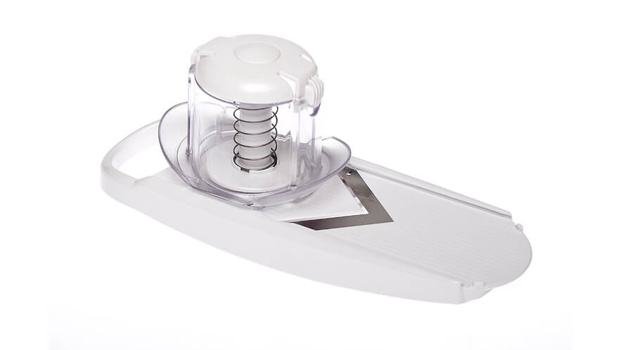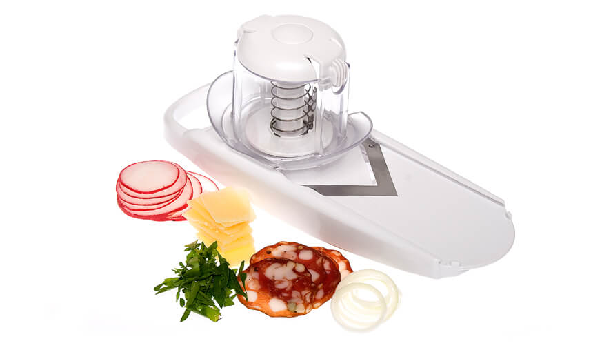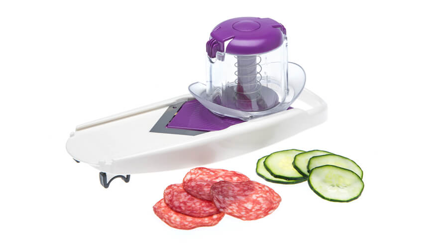 - non-slip feet, that enable safe cutting without the risk of slippage. When slicing food into a container, fit the slicer to the edge of the container and ensure your counter will stay clean;
